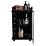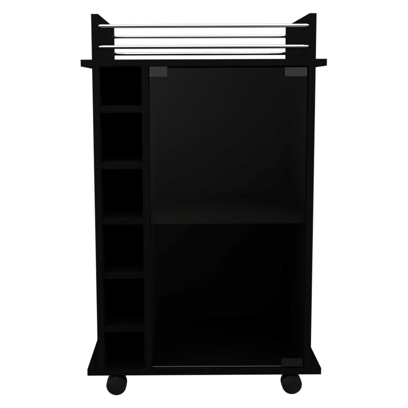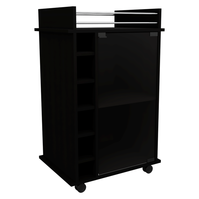 Bar, con 1 puerta batiente de vidrio, rodachines, espacio para porta botellas y copas.