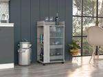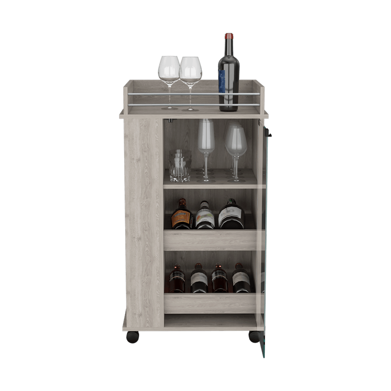 Bar, Con amplios espacios para ubicar copas y botellas, patas metálicas, y diseño moderno.