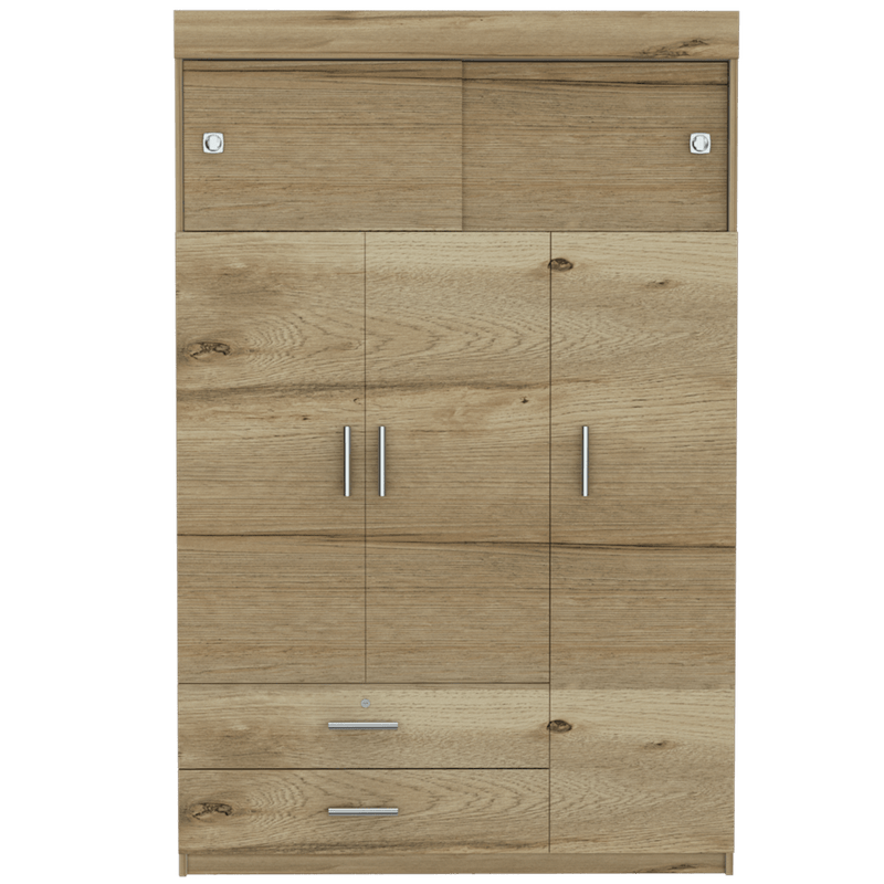 Closet, con 1 tubo cromado, 2 cajones multiusos, 2 puertas corredizas, 3 puertas batientes con manijas, y variedad de entrepaños. Elaborado en Madera aglomerada MDP, recubierta con láminas melamínicas de excelente calidad, en color Café claro y Blanco. Sus medidas son: Alto: 187,5 cm Ancho: 120 cm Fondo: 51,5 cm El tiempo de entrega de este producto es de 3 a 8 días hábiles. Su garantía es de 3 años en madera y 1 en herrajes. Pregunta ya por nuestro servicio de armado y envío gratis. Importante: Este producto no incluye elementos decorativos ni ambientación.