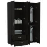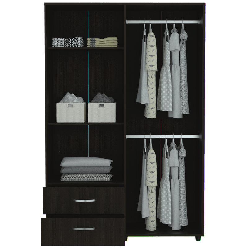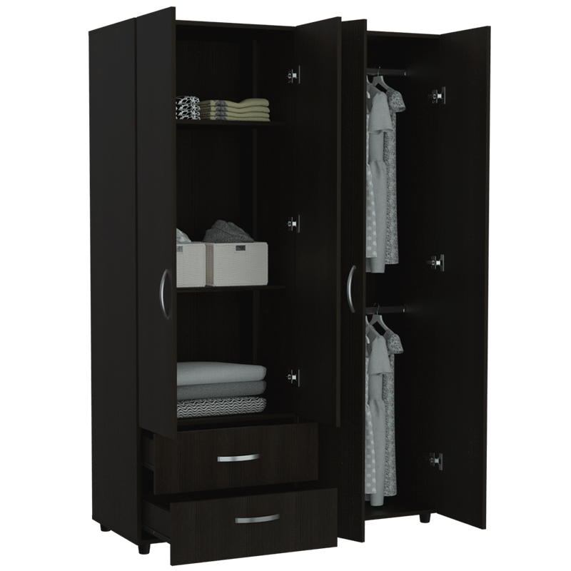 Closet, con 2 tubos cromados, 4 puertas abatibles, entrepaños para poner ropa, y 2 cajones organizadores.
