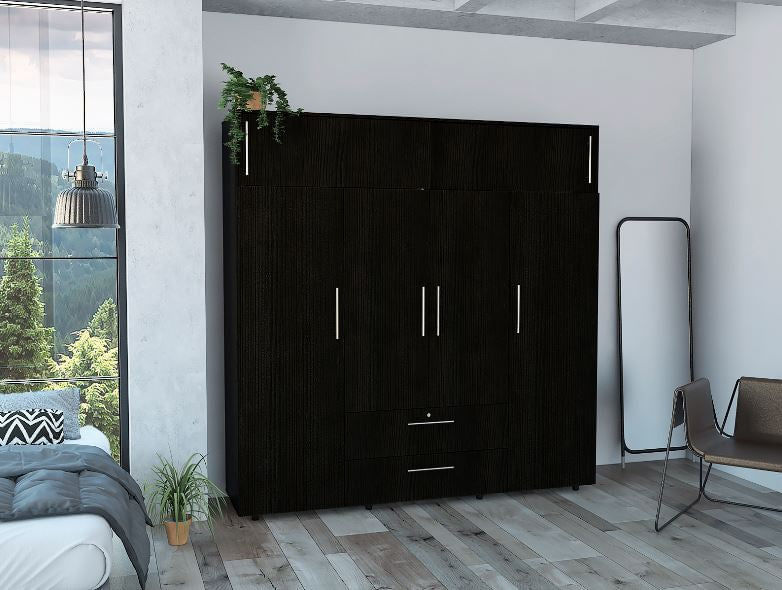 Closet, con 2 puertas corredizas, 4 puertas abatibles, 4 cajones, 3 tubos para colgar ropa y variedad de entrepaños.