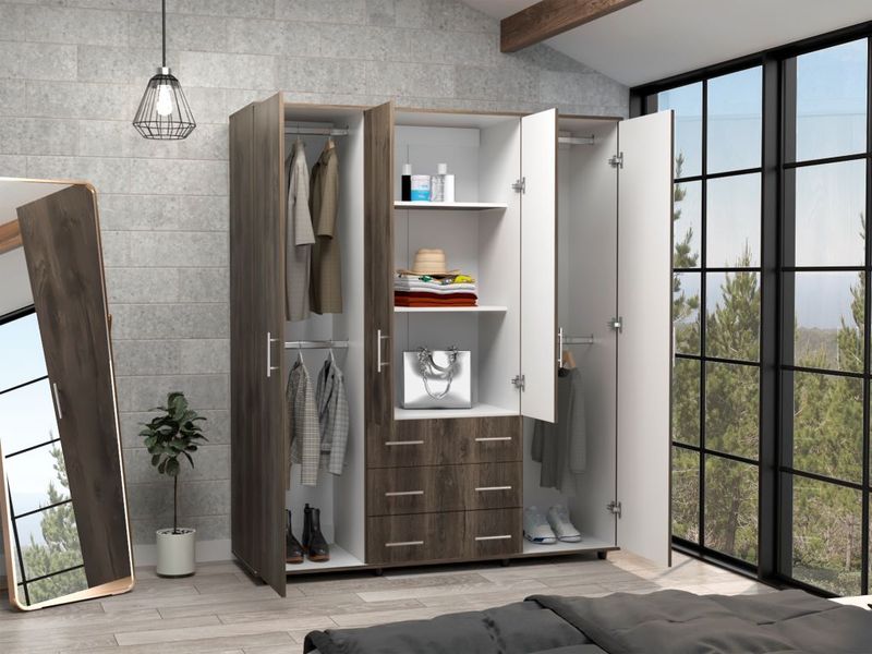 Closet, con diseño funcional; 4 puertas abatibles, 3 cajones organizadores; amplios espacios para guardar ropa, accesorios y zapatos; y 4 tubos cromados para colgar ropa.