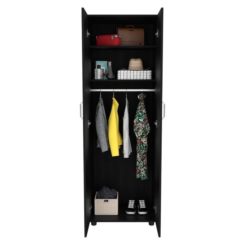 Closet, con 2 puertas abatibles, 2 tubos para colgar prendas, y 3 entrepaños para organizar.