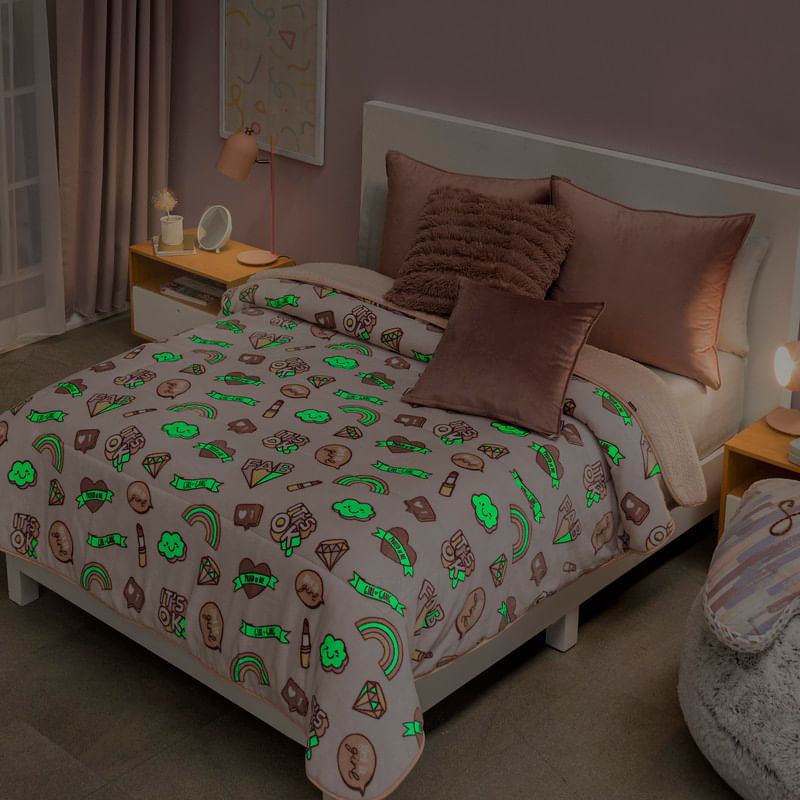 Dale a tu habitación esa personalidad fabulosa y divertida con la cobija invernal Fun ya que por su increíble paleta de color de lilas cálidos y toques en menta hará de tu espacio un lugar lleno de alegría.. Cobija invernal con primera vista de textura suave Beauty Soft que brilla en la oscuridad y su segunda vista de borrega premium. Brilla en la oscuridad. No incluye accesorios decorativos. DOBLE FAZ