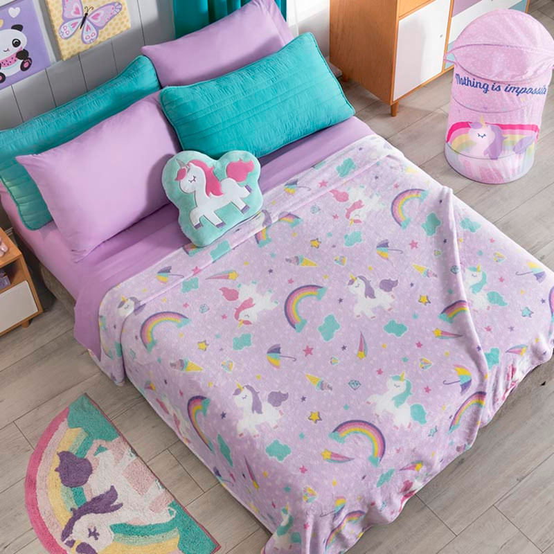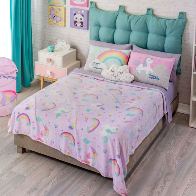 Una cobija, con su tejido meticuloso y su suavidad envolvente, se convierte en el abrazo gentil del confort. Su presencia evoca instantes de serenidad, invitando a sumergirse en su calidez mientras el mundo se desvanece en un suave susurro de comodidad. Cobija de tendencia unicornio que podrás llevar a todos lados, con un diseño divertido y mágicos destellos que podrás disfrutar en todo momento con su textura beauty soft. NO INCLUYE ACCESORIOS