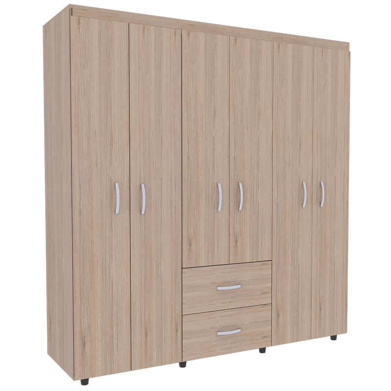 Combo Dormitorio, con Closet de amplios espacios y entrepaños para organizar, seis puertas abatibles, tubos cromados para colgar ropa, dos cajones organizadores multiusos, deslizadores plásticos para apoyo al piso, manijas metálicas y mesa para TV con espacio superior para ubicar TV hasta de 50”, patas plásticas para fácil desplazamiento, espacio para ubicar equipo de audio y video.