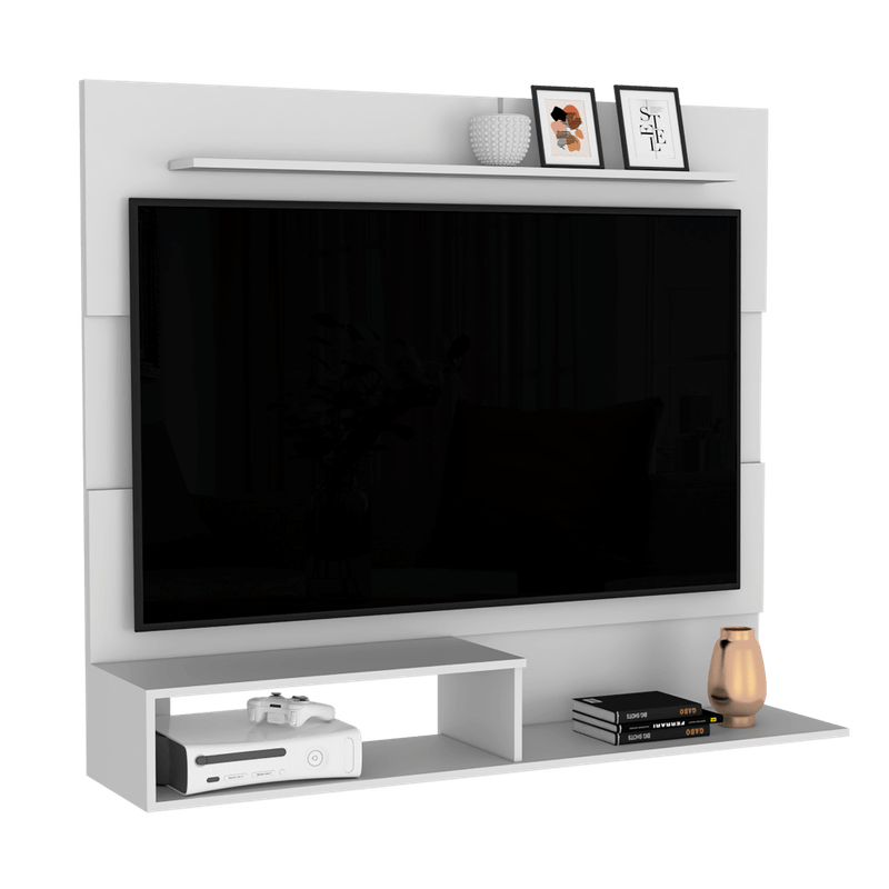 Panel para TV, múltiples entrepaños y superficies para ubicar objetos.
