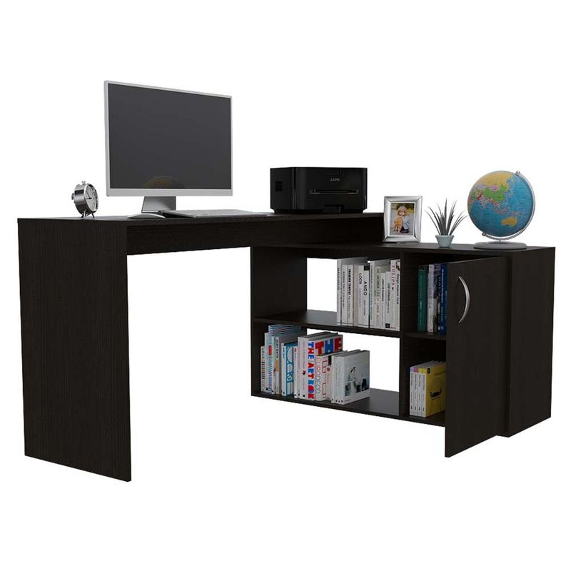 Escritorio en L, cuenta con amplia superficie de trabajo y el eje de lateral tiene amplios entrepaños para ubicar libros u otros elementos de trabajo, estudio y un práctico espacio con puerta para almacenar múltiples objetos.
