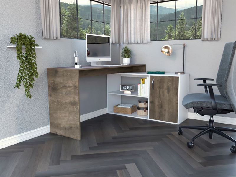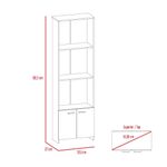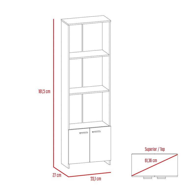 Biblioteca, con 4 de entrepaños y, 2 puertas batientes, y escritorio en L, con espacio con puerta batiente para almacenar libro u otro, y compartimiento para objetos de estudio o decorativos.