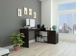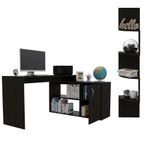 Escritorio en L, cuenta con amplia superficie de trabajo y el eje de lateral tiene amplios entrepaños para ubicar libros u otros elementos de trabajo, estudio y un práctico espacio con puerta para almacenar múltiples objetos.
