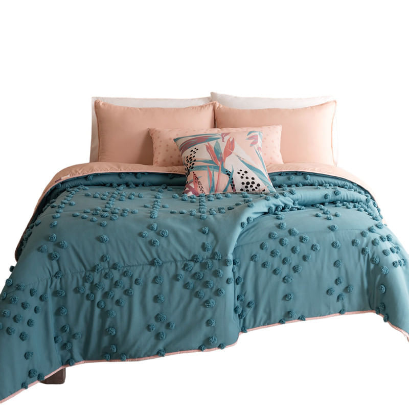 Haz de tu cama el punto focal de tu habitación con este increíble edredón con pompones que le dará un toque fresco y femenino por su combinación de colores turquesa y rosa en conjunto con sus cojines de inspiración tropical. DOBLE FAZ