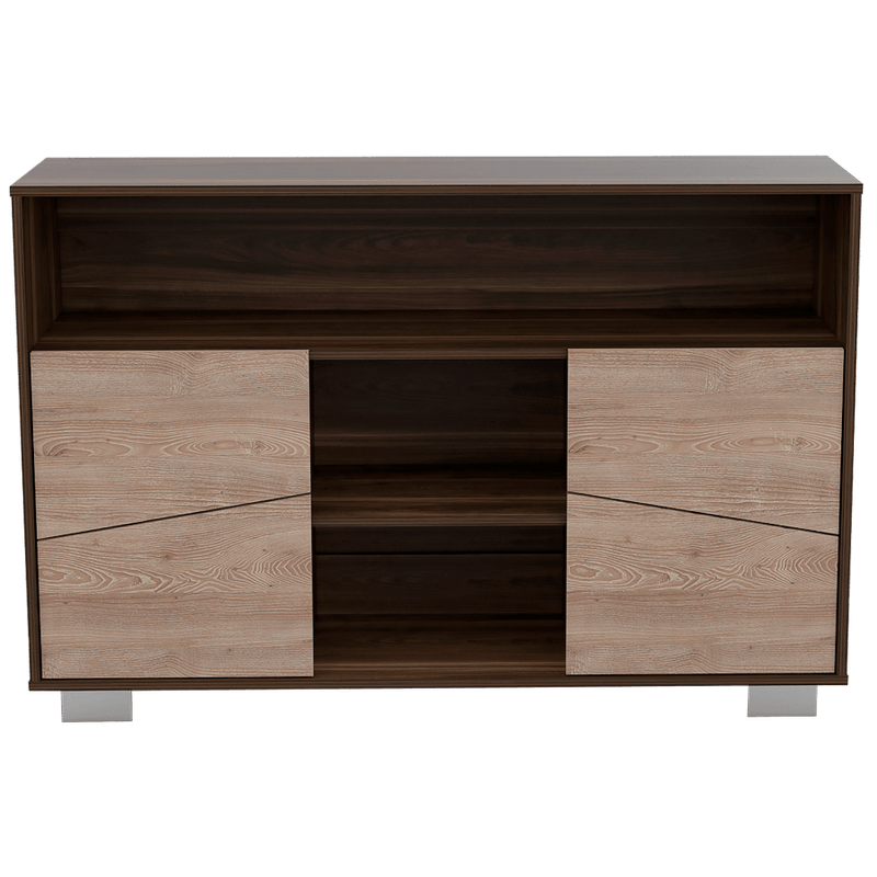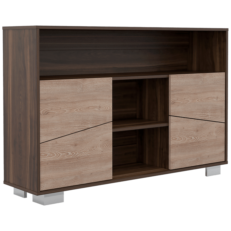 Mesa Auxiliar, con espacio para ubicar libros y objetos decorativos, 4 puertas batientes, y patas en acero.