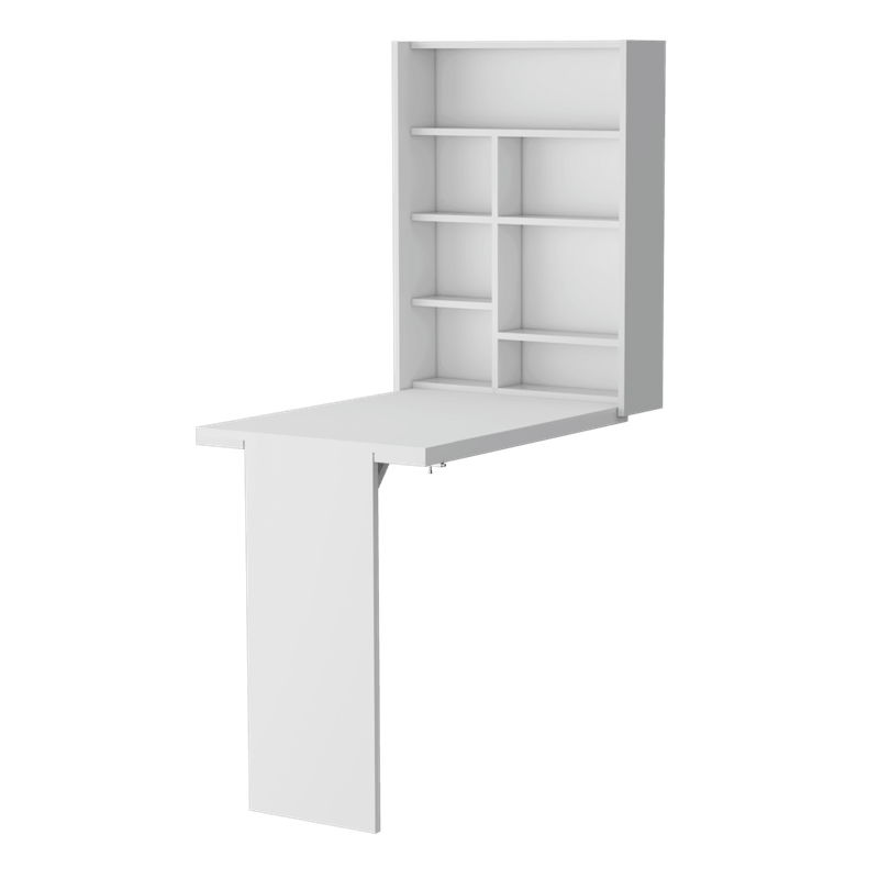 Mesa para empotrar en la pared con superficie plegable para ahorrar espacio, entrepaños para ubicar multiples objetos, espacios para almacenamiento.