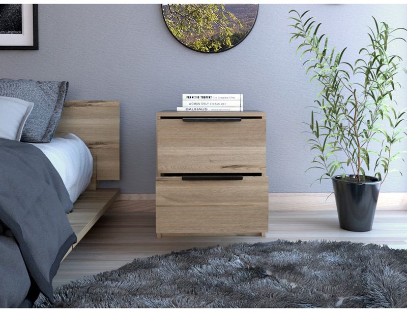 Mesa de Noche, con diseño contemporáneo, contiene dos cajones e incluye manual de ensamble.