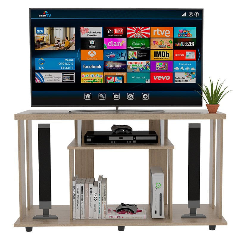 Mesa para TV, con espacio superior para ubicar Tv hasta de 50 “pulgadas, espacio para ubicar equipo de audio y video; y patas plásticas para fácil desplazamiento. Elaborado en Madera aglomerada MDP, recubierta con láminas melamínicas de excelente calidad, en color Beige. Sus medidas son: Alto: 67,4 cm Ancho: 120,8 cm Fondo: 42 cm El tiempo de entrega de este producto es de 3 a 8 días hábiles. Su garantía es de 3 años en madera y 1 en herrajes. Pregunta ya por nuestro servicio de armado y envío gratis. Importante: Este producto no incluye elementos decorativos ni ambientación.
