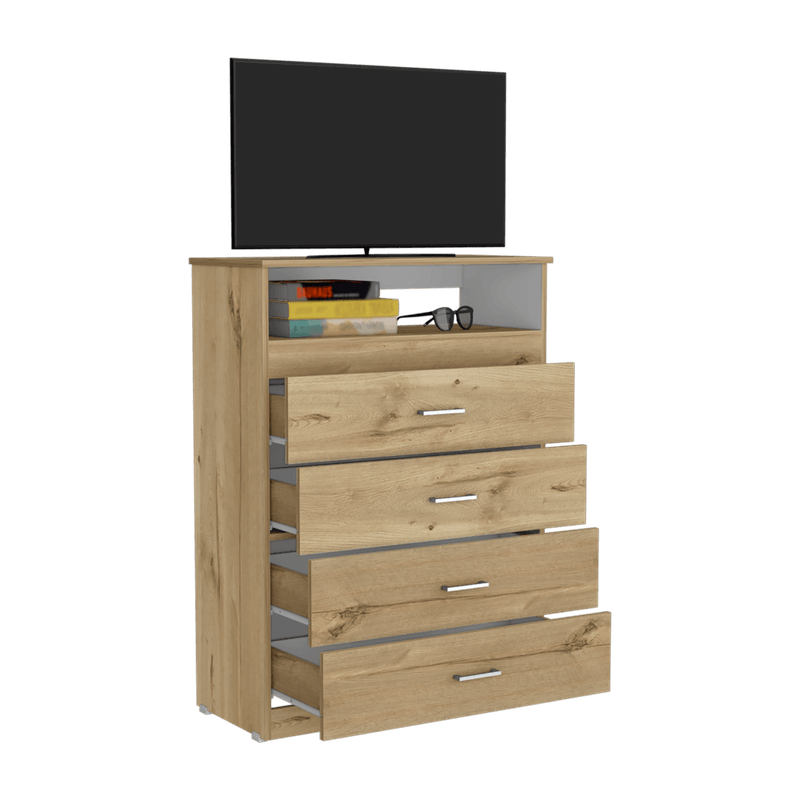 Organizador, con espacio para objetos decorativos, compartimiento para equipos de audio y video, espacio superior para TV de 40'' máximo.